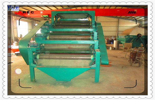 2、四辊锰矿磁选机是我公司新研制成功的磁分离设备。磁系全部采用高性能稀土钕铁硼材料和优质铁氧体材料制做,经过巧妙的开放式磁路设计,筒表分选区高磁感应强度达到0.8T以上,磁场强度是常规中磁机的3-5倍,分选区的磁场力可达到电磁AB(中国)的磁力水平。